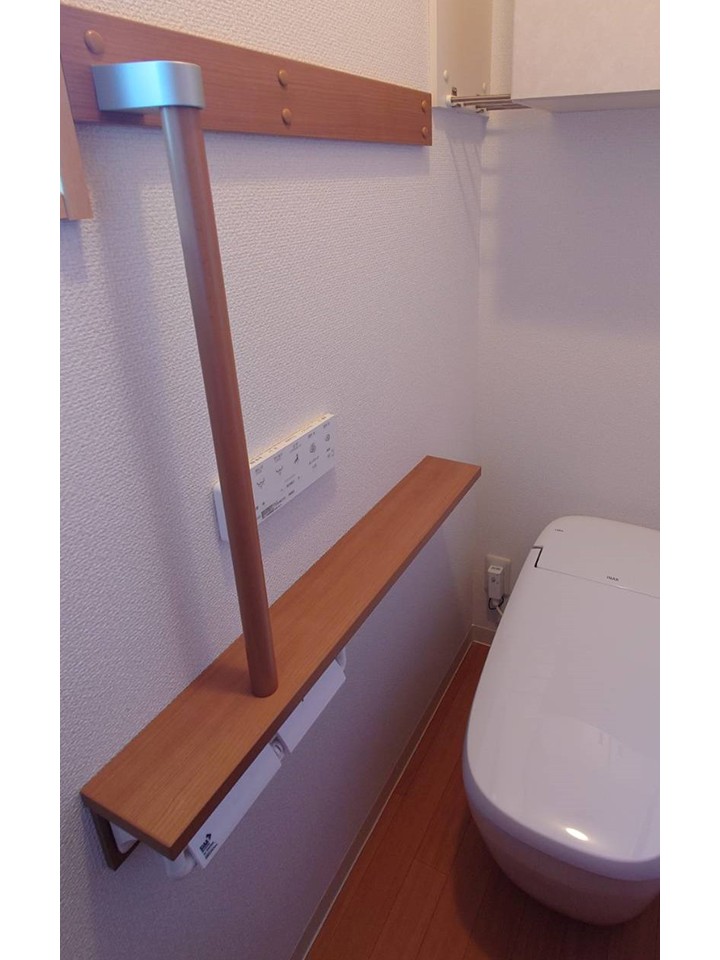 トイレの交換と同時に、手摺り付き紙巻き器も設置し、フローリングやクロスも張り替えたので素敵な空間になりましたね。