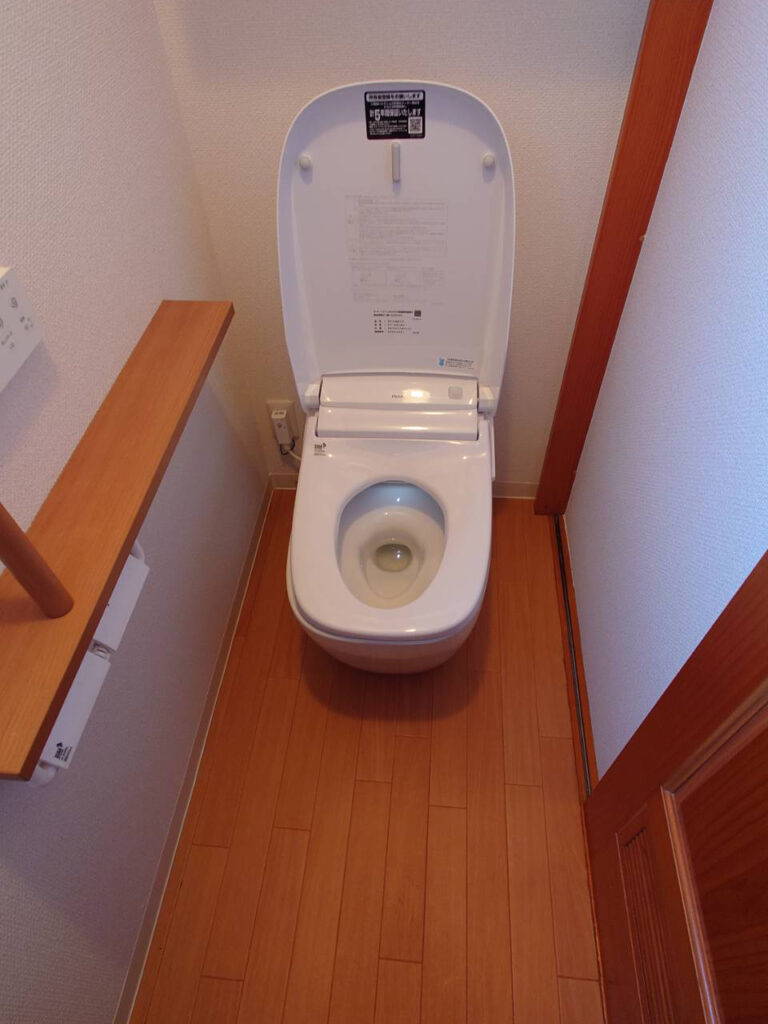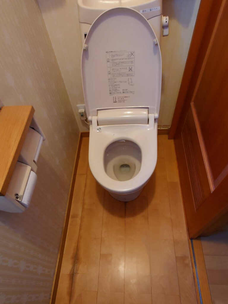 徳島市 某邸:1階のシャワートイレ(LIXIL INAXアメージュ)の便座から水漏れがあり、床が木質フローリングだったので傷んでしまいました。今回、シャワートイレの交換に加え、床・クロスも張り替えました。新しいトイレはLIXIL INAXサティスです。以前のものと比較すると、車で例えれば普通乗用車と高級乗用車ぐらいの違いがあるトイレだそうです。