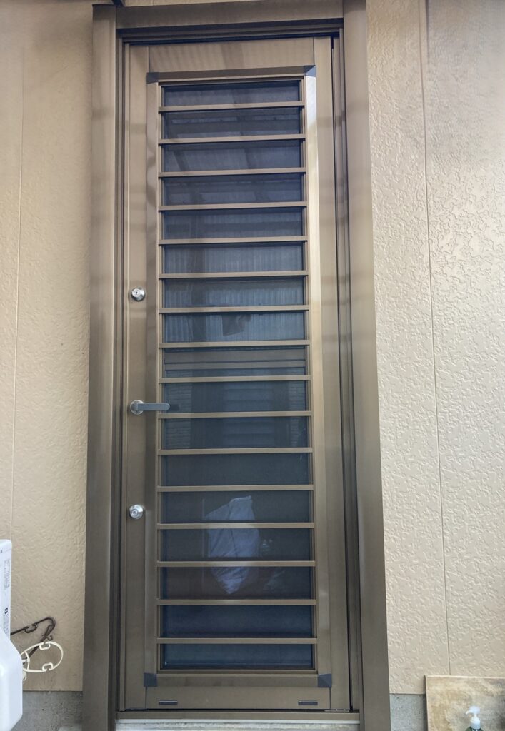 既存の勝手口ドアのランマ部分を除去して、背の高い勝手口ドアに取り替え、外額縁の周囲には勝手口ドアと似た色のコーキングを施工しました。リシェント勝手口ドアの本体には、上げ下げ採風機構を採用しています。採風部分には網戸が付いているのでドアを閉めたままで換気が可能です。